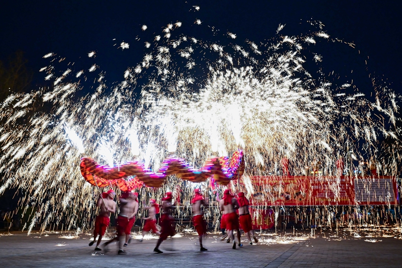 民間藝人在河南省洛陽市2024隋唐河洛文化廟會上表演打鐵花(2024年2月14日攝)。新華社發(李衛超 攝)